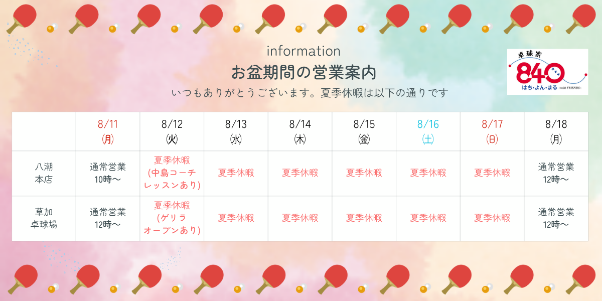 今後も、皆様に愛される卓球家840を目指し、サービスの向上に努めて参ります所存ですので、